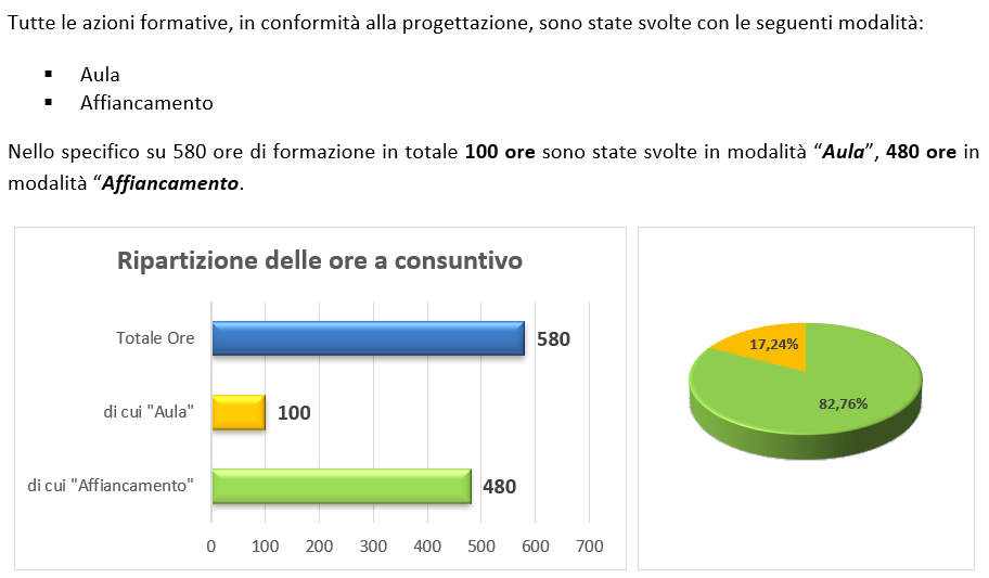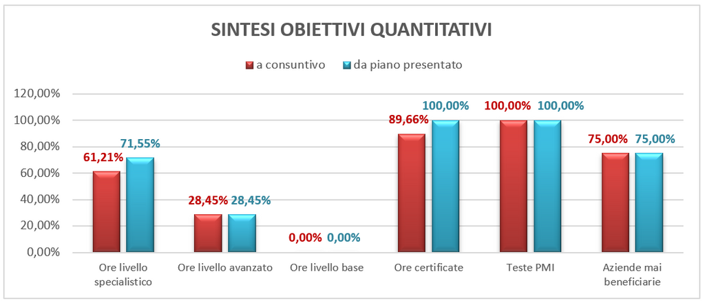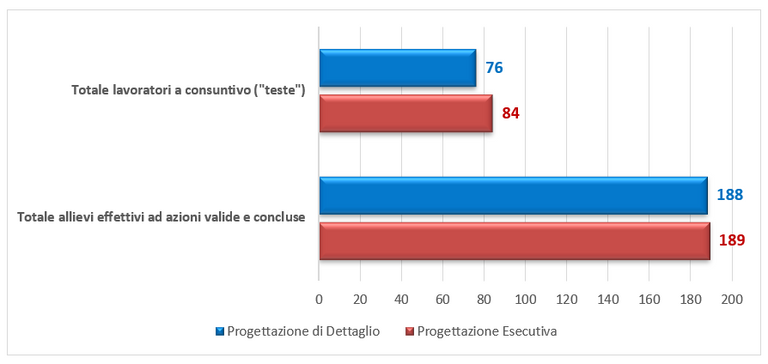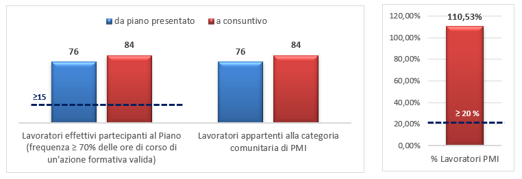 A conclusione dei percorsi formativi il numero degli allievi effettivi ad azioni valide e concluse è stato pari a 189 (da piano presentato erano 188). Nel complesso il totale a consuntivo dei lavoratori (“teste”), con la frequenza minima richiesta rispetto alle ore previste per l’azione formativa valida a cui hanno partecipato, è stato pari a 84 (da piano presentato era 76).