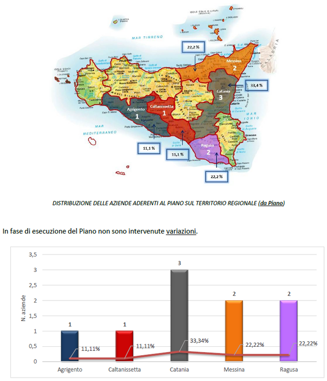 In sede di presentazione del Piano, le aziende beneficiarie della formazione erano n. 09, collocate, geograficamente, in cinque province (Agrigento, Caltanissetta, Catania, Messina e Ragusa).